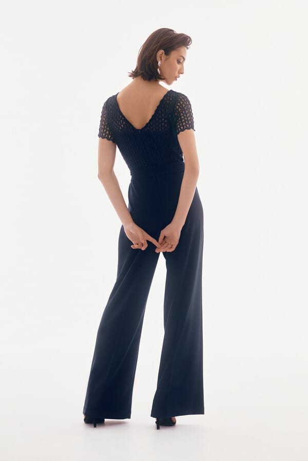 Este conjunto elegante de pantalón y top es la combinación perfecta entre sofisticación y comodidad. El top está confeccionado con un hermoso encaje en tonos oscuros, lo que aporta un aire delicado y femenino, mientras que el pantalón de pierna ancha garantiza una silueta estilizada y un look moderno. El diseño incluye un cinturón atado en la cintura, que resalta la figura y aporta un toque extra de estilo. Su corte y tejido fluido hacen de este conjunto una opción ideal para ocasiones formales o cenas especiales.