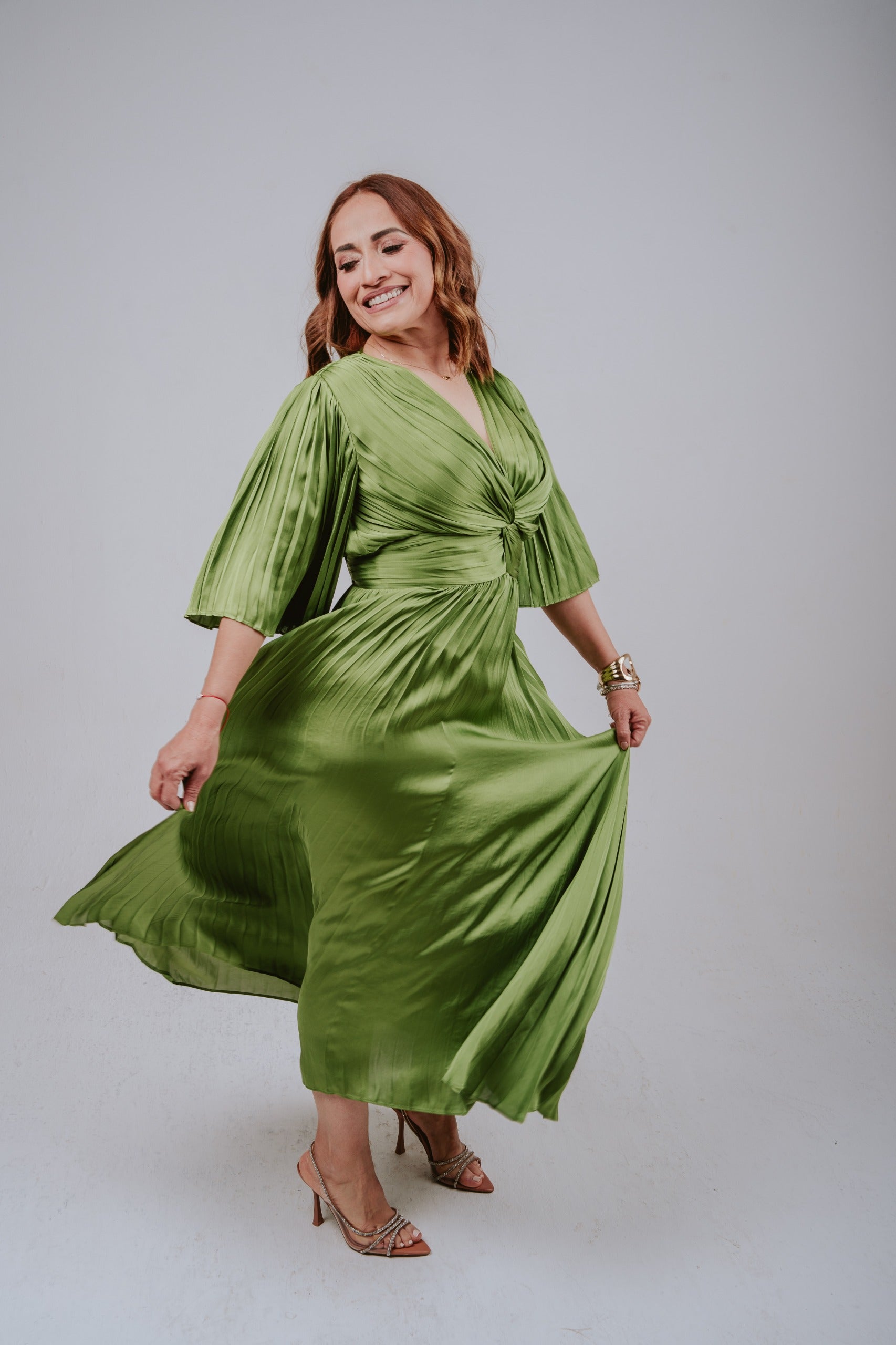 Este vestido largo plisado en tono verde olivo es la definición de elegancia y frescura. Con un diseño fluido que enmarca la silueta con delicadeza, destaca por su escote cruzado, nudo central que realza la cintura, y mangas tipo mariposa de gran caída que aportan movimiento y sofisticación.
